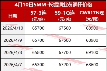 【SMM价格】2026年4月10日长振黄铜棒价格