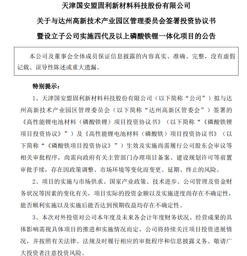 盟固利(301487.SZ)公告称,公司拟与达州高新技术产业园区管理委员会签署投资协议,并出资5亿元设立全资子公司四川盟固利新材料科技有限公司,实施四代及以上磷酸铁锂一体化项目。该项目包含磷酸铁锂及磷酸铁两个子项目,均分两期建设。