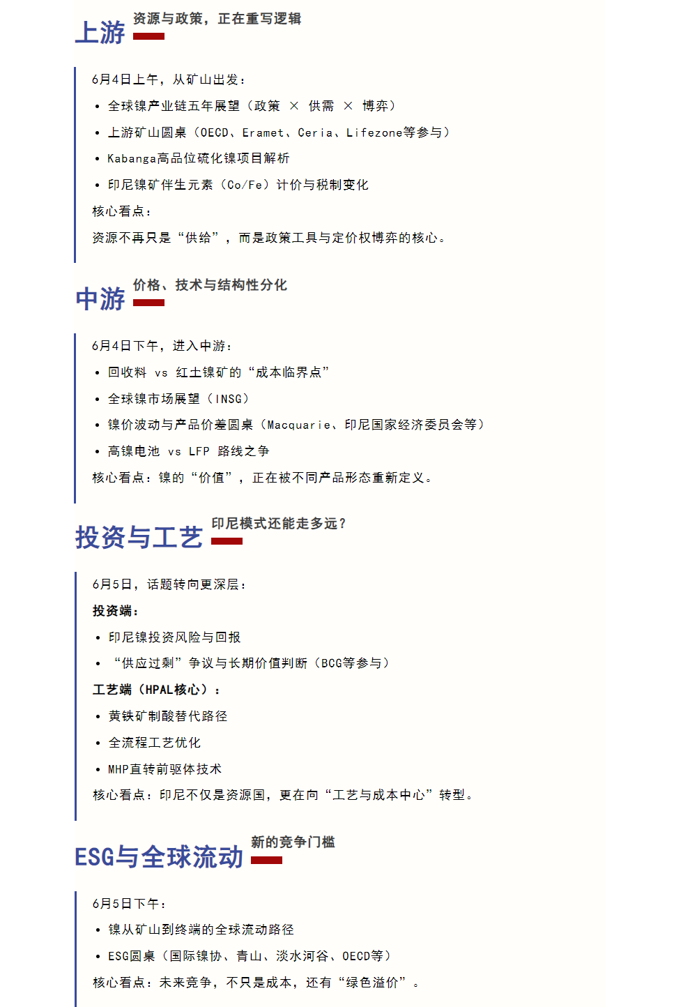 本次印尼矿业大会·镍钴论坛,围绕“矿山—中间品—终端市场”三大核心环节,搭建完整对话框架。