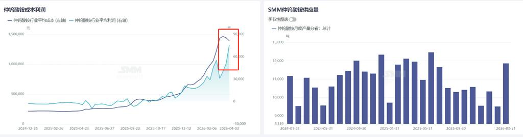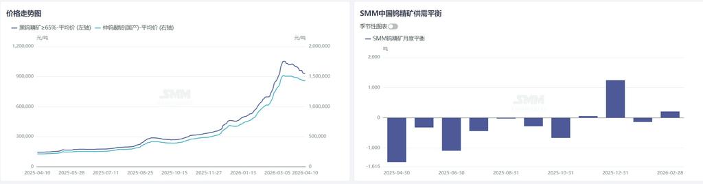 一季度国内钨矿生产企业开工率整体处于低位运行,其中 2 月份受多重因素影响,矿山开工率进一步回落至 40% 以下,直接导致 3 月上旬市场钨精矿现货流通偏紧。3 月以来,国内矿山开工率逐步回升至 65% 左右,但上旬部分产区仍受开采指标、生产节奏等因素制约,出货量有限,叠加行业内存在一定隐形库存,市场整体货源并未明显宽松。与此同时,国内持续加大对非法盗采、灰色产业链的整治力度,散货、黑钨矿流通量显著减少。3 月部分地区已开展违规进口钨矿贸易核查工作,相关审查力度趋严,亦将对后续钨精矿进口量形成一定影响。进入 4 月,随着首批开采指标陆续下达,叠加当前行业盈利水平较好,矿山生产积极性明显提升,钨精矿供应趋于稳定,市场流通较一季度有明显好转。