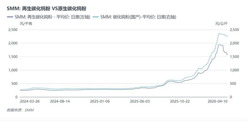 一季度下游粉末行业同比来看表现为量价齐升的情况,尤其是1-2月份国内主流粉末企业订单较好,企业开工率较去年同期增长13个百分点左右,一季度行业平均开工率在65%左右。环比来看,一季度是硬质合金等产业的淡季,开工率较25年四季度70%的开工率呈现较大下降的情况。三月下旬以来,国内钨市场弱势整理,终端观望情绪浓厚,部分粉末企业新增订单下降明显,行业开工走弱为主。除此之外,3月下旬国内废钨市场大幅下跌,导致锌熔料及电解碳化钨粉等产品价格快速下滑,原生与再生碳化钨粉价差持续扩大的情况下,丧失部分竞争优势。