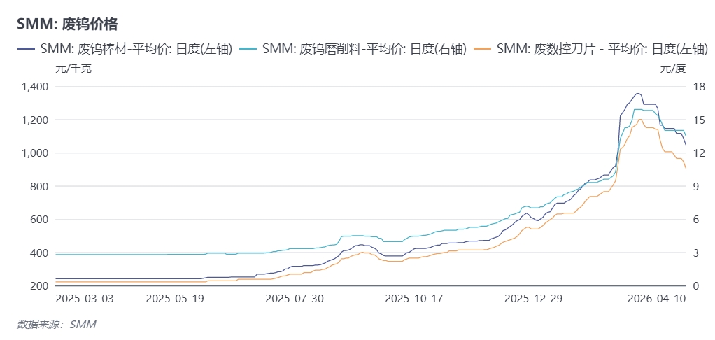 废钨市场:3月废钨市场走出极端“Λ”型行情。上半月在钨价整体暴涨带动下,废钨钢铣刀、废钨钻头等品种价格一度突破1000元/公斤,创历史新高;下旬行情急转直下,3月27日废钨刀片单日暴跌6.45%,引发贸易商恐慌性抛售,截止4月10日废钨棒材、钻头等价格自高位回落约23%-25%,回吐3月上旬涨幅。近期国内针对再生资源税务加大执法力度,废钨流通环节中合规性不足问题暴露,部分废钨资源存在无票转手、发票不规范、主体不清晰等问题,在税务监管趋严背景下,这类资源向下游传导面临更高合规成本与流通阻力,从而对价格形成阶段性压制。从政策导向看,税务部门已明确将再生资源、回收利用等领域作为重点整治对象,未来对高风险企业、异常开票行为的核查将持续加强。受此影响,4月废钨市场短期可能继续承压,非规范渠道资源加速出清,市场波动性加大;但经过3月末快速杀跌后恐慌情绪已部分释放,继续大幅下跌的空间有限。