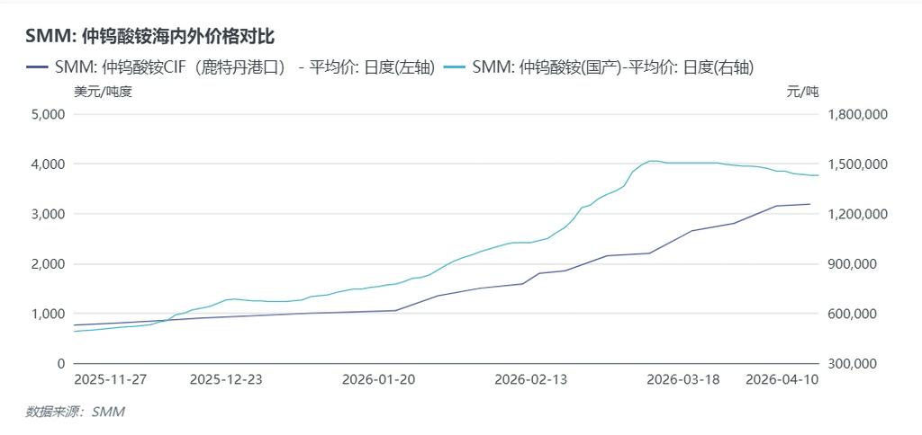 海外市场情况:3月份海外钨市场高为震荡,欧洲APT 及钨制品价格均处于历史高位区间,受中国钨品出口管控持续收紧影响,海外现货流通货源偏紧,叠加军工、高端制造等领域刚需支撑,市场询单活跃,外盘价格对国内形成明显溢价。同时海外矿山新增产能有限,原料端补给不足,进一步支撑海外钨市维持强势格局。截止4月9日,欧洲鹿特丹APT收报3150-3220美元/吨度(折算成不含增值税人民币价格约192.4-196.6万元/吨)较3月初上涨48.1%,海内外价差持续扩大。