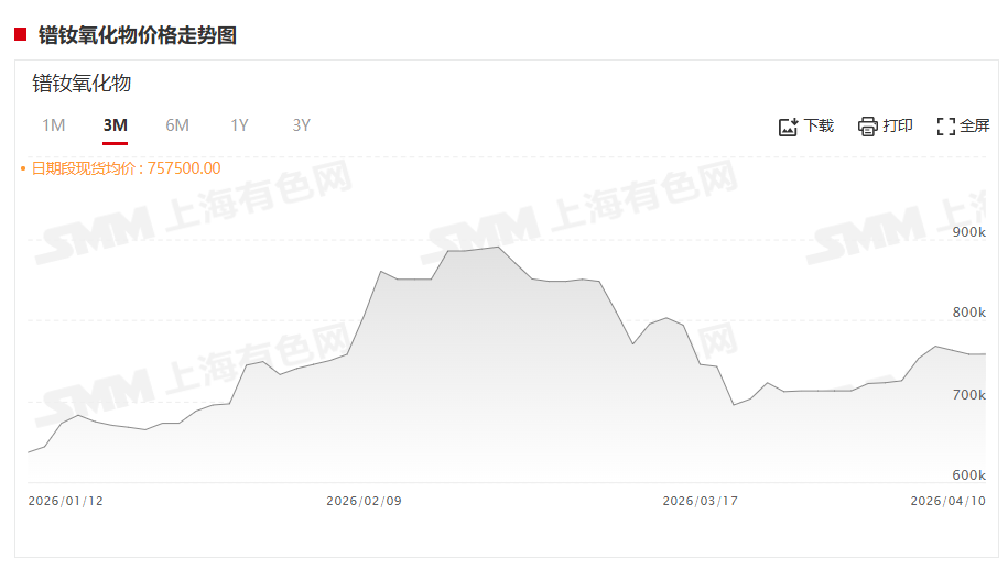 当前氧化镨钕的价格持稳运行,据SMM报价显示,氧化镨钕4月10日的均价为757500元/吨,较前一交易日持平。不过,在当前上下游博弈明显,市场成交僵持的背景下,考虑到二季度稀土精矿交易价格超预期上调,将给氧化镨钕价格带来成本端的支撑。