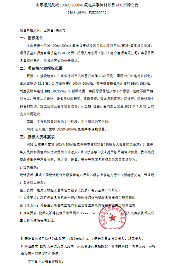 北极星储能网获悉,4月9日,山东德州武城100MW/200MWh氢电共享储能项目EPC招标公告发布。
