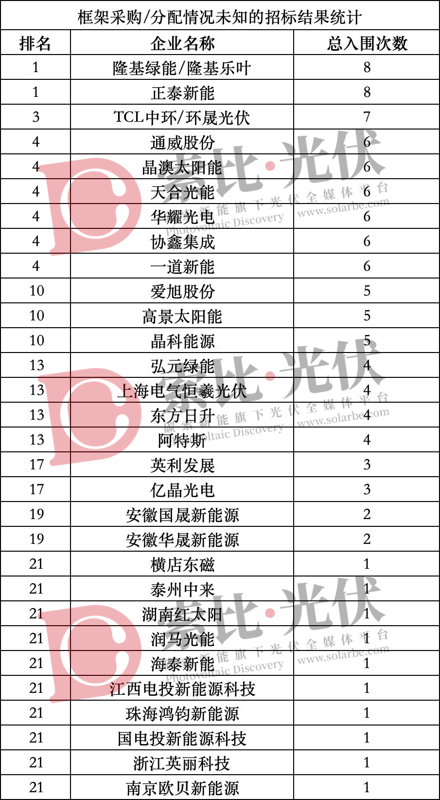 从框架招标入围次数来看,隆基绿能(隆基乐叶)与正泰新能以8次入围并列榜首,是一季度框架集采的最大赢家;TCL中环(环晟光伏)以7次入围位居第三,紧随其后的通威股份、晶澳太阳能、天合光能、华耀光电、协鑫集成、一道新能均斩获6次入围,爱旭股份、高景太阳能、晶科能源也以5次入围跻身第一梯队。此外,弘元绿能、东方日升等18家企业在不同企业的框架集采中也有所斩获。