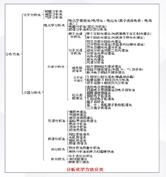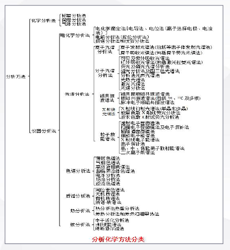 化学成分分析应用的技术是分析化学。分析化学是测量物质的组成和结构,研究物质化学组成的分析方法及相关理论的科学。根据分析原理、分析手段的不同,分析化学方法分为化学分析法和仪器分析法两大类。具体类别见图所示,铝合金化学成分分析常用的只是其中滴定分析法、原子光谱分析法、可见及紫外吸收光谱法等几种方法。