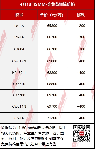 【SMM价格】2026年4月13日金龙黄铜棒价格