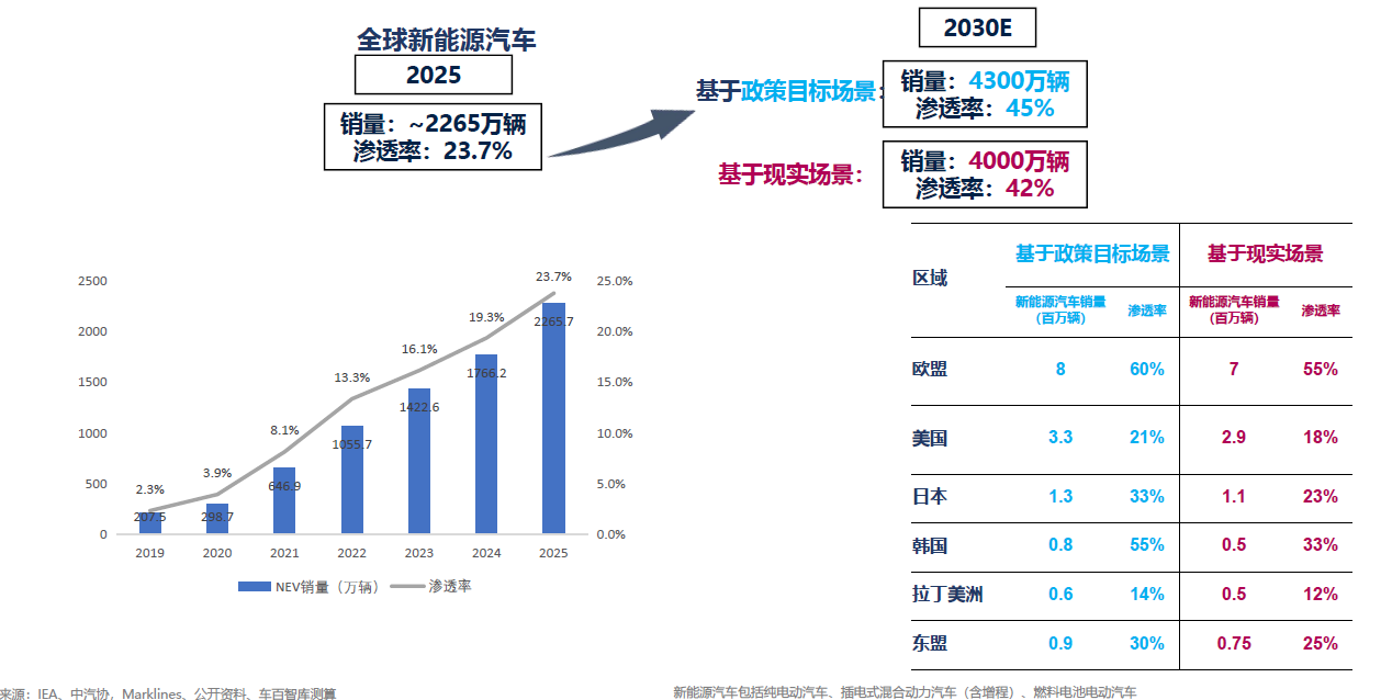 其中国内方面,2025年新能源汽车销量(国内)1387.5万辆,渗透率(国内)50.8%;2026年新能源汽车销量(国内)约1600-1650万辆,渗透率(国内)接近60%;2030年预计新能源汽车渗透率(国内)接近75%。