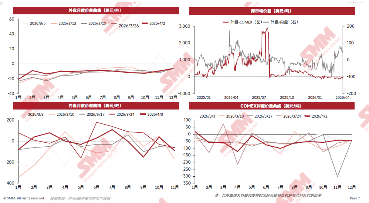 外盘月度价差曲线、跨市场价差、内盘月度价差曲线、COMEX月度价差曲线