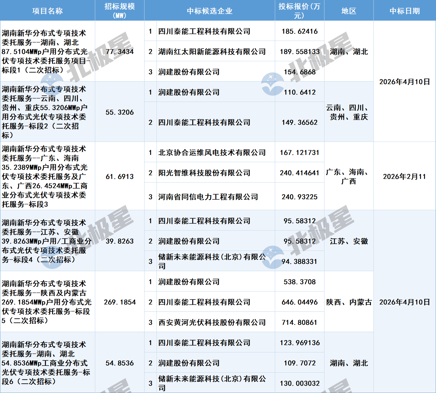4月10日,中核集团电子采购平台公布湖南新华568MW分布式光伏专项技术委托服务项目(二次招标)中标候选人,入围企业有8家:四川泰能工程科技有限公司、湖南红太阳新能源科技有限公司、润建股份有限公司、北京协合运维风电技术有限公司、阳光智维科技股份有限公司、河南省同信电力工程有限公司、储新未来能源科技(北京)有限公司、西安黄河光伏科技股份有限公司。