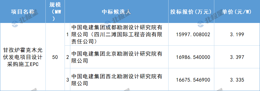 4月13日,甘孜炉霍克木光伏发电项目设计采购施工EPC标段(设计施工总承包EPC标段)中标结果公示,中标候选人第一名为中国电建集团成都勘测设计研究院有限公司(四川二滩国际工程咨询有限责任公司),单价3.199元/W。