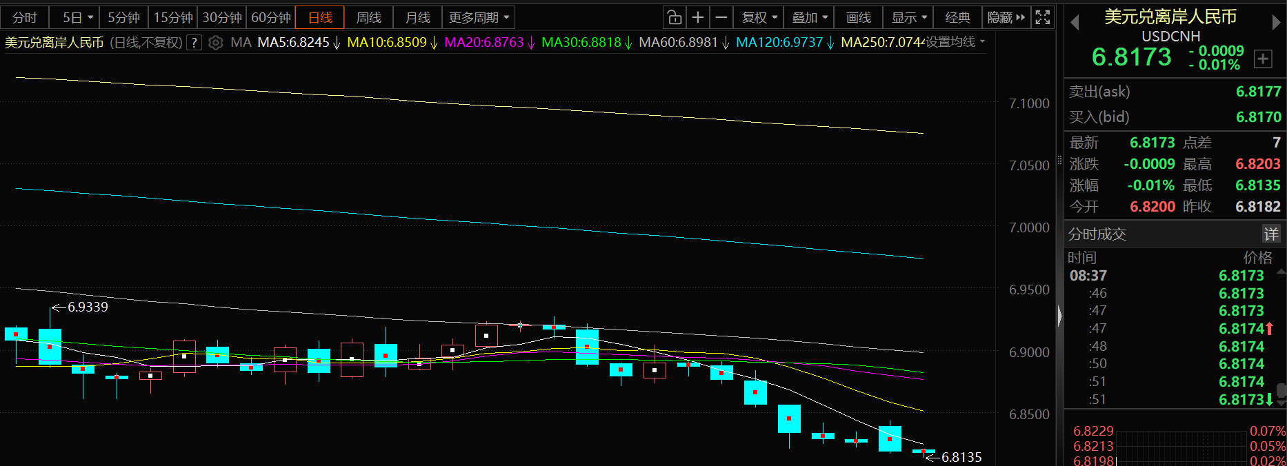 随着美元指数持续走弱,人民币出现明显攀升,美元兑离岸人民币七连跌,截至4月13日收盘,美元兑离岸人民币跌0.1%,收报6.8182。4月14日开盘,美元兑离岸人民币继续小幅走弱,盘中最低跌至6.8135。