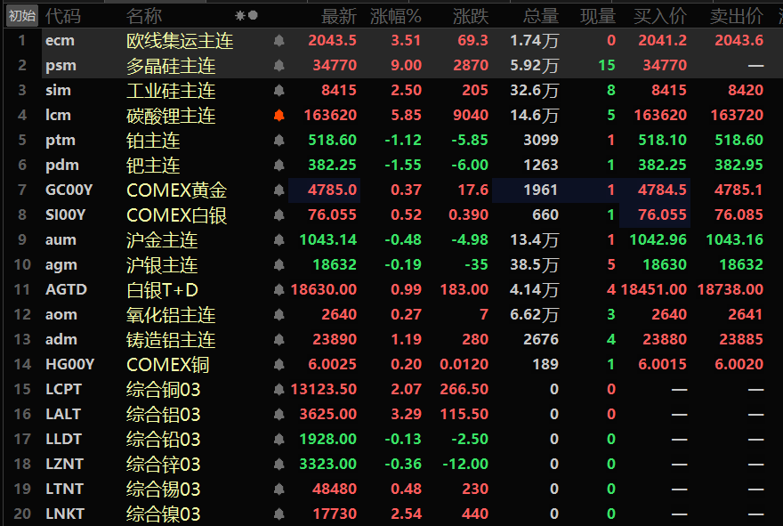 隔夜外盘金属方面,LME基本金属普涨。伦铜涨2.07%。伦铝涨3.29%,伦铅跌0.13%。伦锌跌0.36%。伦锡涨0.48%。伦镍涨2.54%。