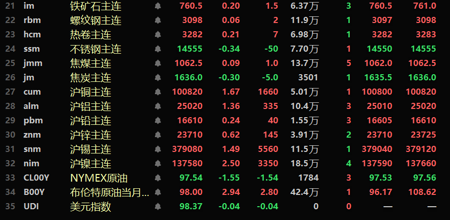 隔夜美元指数延续前五个交易日的跌势继续跌0.28%,报98.41。美元指数一度因避险需求跳涨,随后全日持续回落,最终尾盘跌至3月3日以来最低。美伊和谈虽陷僵局,但美国总统特朗普表示伊朗仍有意达成协议,提振投资者风险偏好。(华尔街见闻)