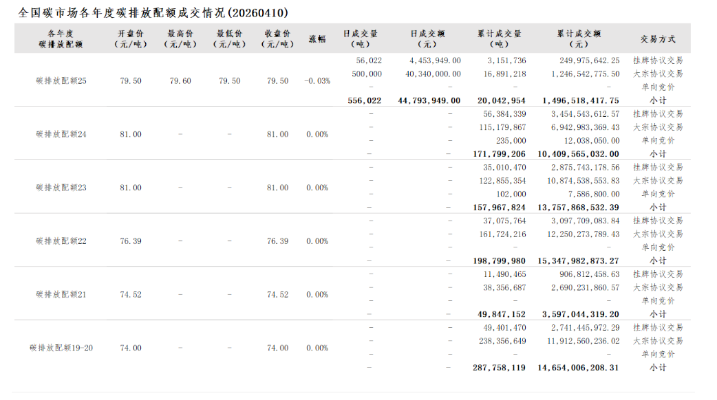 2026年1月1日至4月10日,全国碳市场碳排放配额成交量21,348,715吨,成交额1,600,367,151.35元。