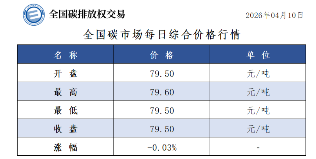 今日全国碳市场综合价格行情为: 开盘价79.50元/吨,最高价79.60元/吨,最低价79.50元/吨,收盘价79.50元/吨,收盘价较前一日下跌0.03%。