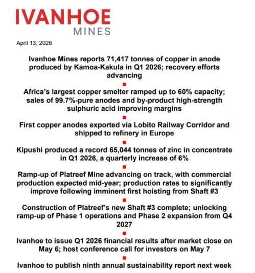 艾芬豪矿业(Ivanhoe Mines)周一表示,得益于刚果(金)旗舰卡莫阿-卡库拉(Kamoa-Kakula)矿山的持续爬产,以及南非普拉特瑞夫(Platreef)项目关键基础设施的完工,公司第一季度锌和铜产量均实现增长,进一步强化了增长前景。