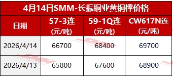 【SMM价格】2026年4月14日长振黄铜棒价格