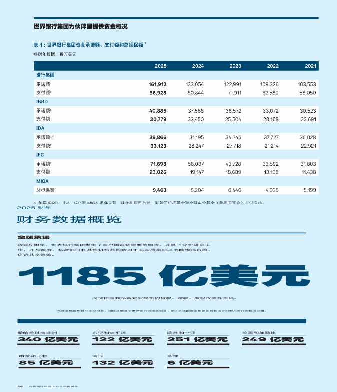 下图1:显示了世界银行集团从2021财年至2025财年对成员国客户承诺额、支付额、和总担保额。