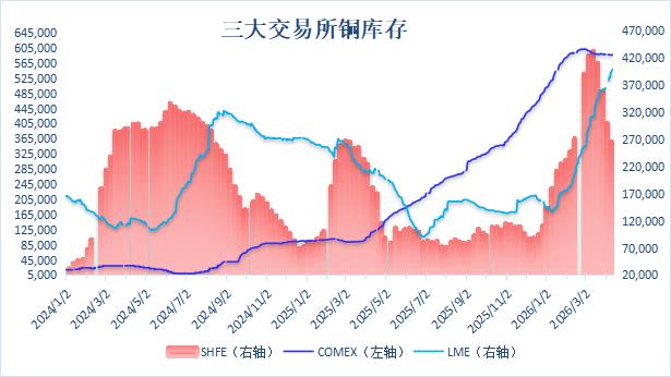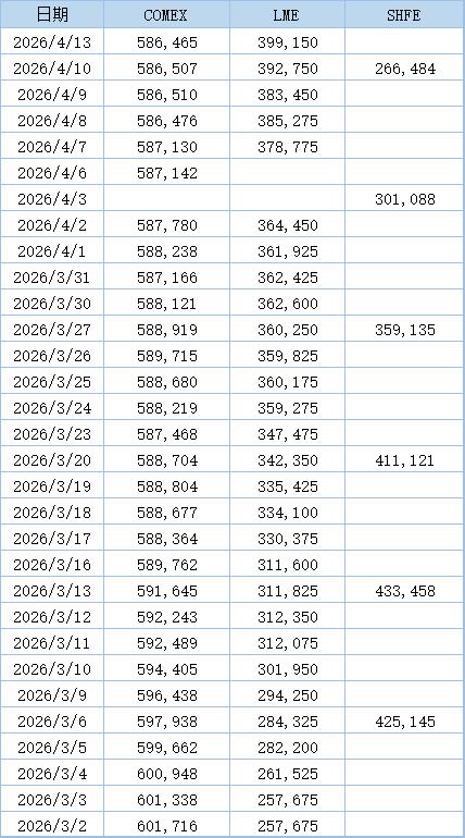 以下为2026年3月以来三大交易所铜库存数据:(单位:吨)
