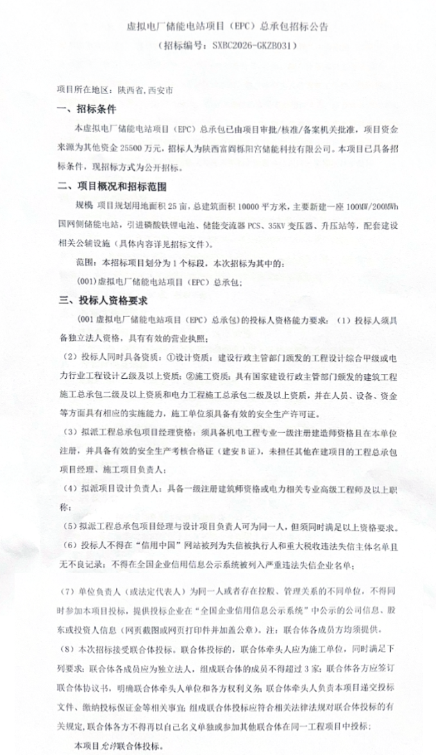 北极星储能网获悉,4月13日,虚拟电厂储能电站项目(EPC)总承包招标公告发布,招标人为陕西富阎栎阳宫储能科技有限公司,项目资金来源为其他资金25500万元,约合单价1.275元/Wh。项目位于陕西西安。