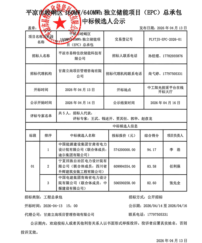 北极星储能网获悉,4月13日,平凉市崆峒区160MW/640MWh独立储能项目(EPC)总承包中标候选人公示,第1、第2、第3中标候选人分别为中国能建甘肃院、投标单价约合0.8972元/Wh;宁夏电力设计院、投标单价约合0.9531元/Wh;中国电建青海院,投标单价约合0.7915元/Wh。
