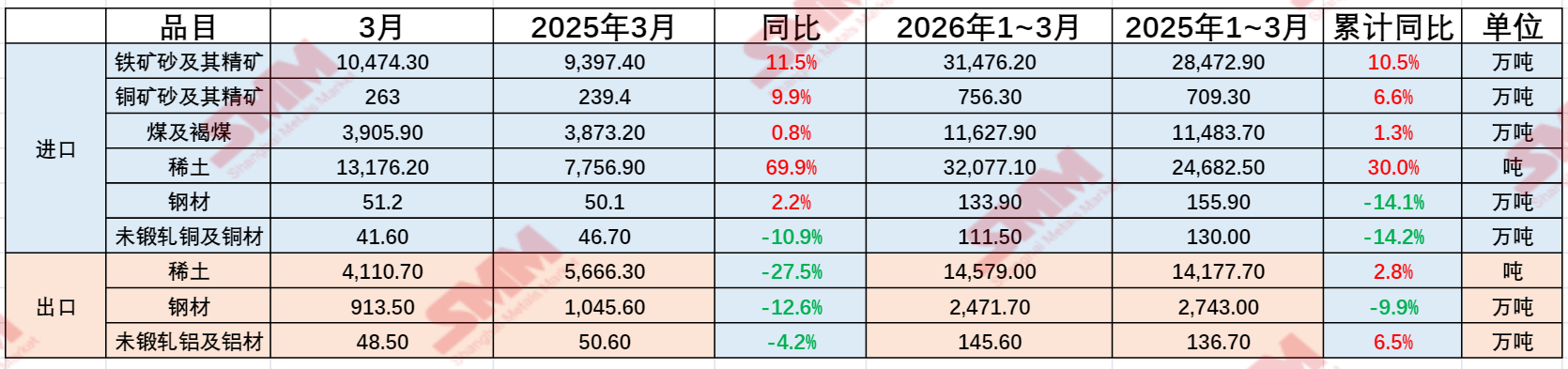 2026年3月铁矿砂及其精矿进口10,474.3万吨,同比2025年3月增长11.5%。2026年1~3月累计进口31,476.2万吨,同比2025年1~3月增长10.5%。