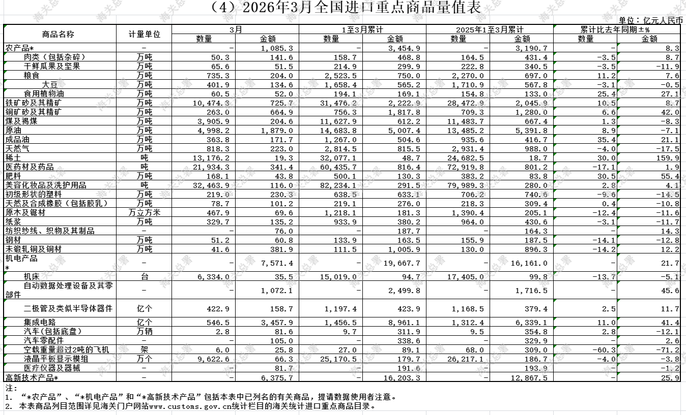 2026年3月稀土进口量达到13,176.2吨,同比2025年3月增长69.9%。2026年1~3月累计进口32,077.1吨,同比2025年1~3月增长30%。