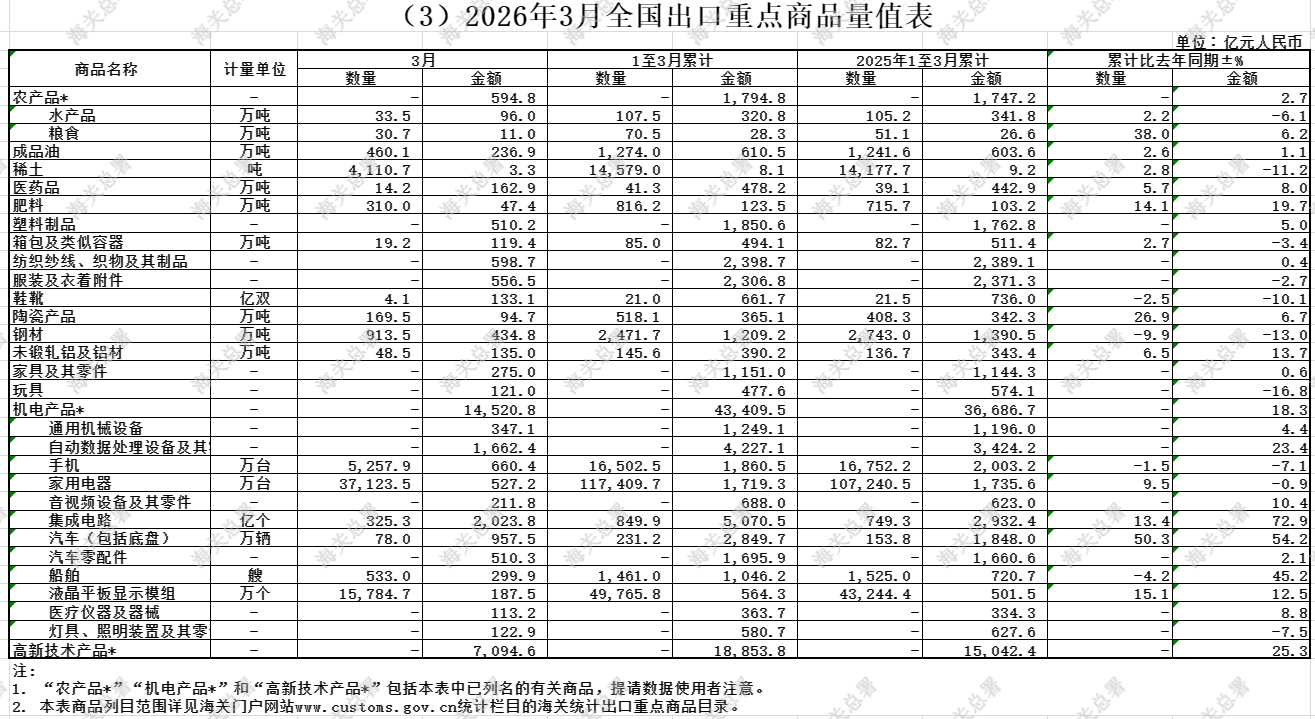 今年是“十五五”开局之年,各地区各部门多措并举稳规模、优结构,企业主动识变应变稳订单、拓市场,推动一季度我国进出口实现较快增长。但是同时我们也要看到,当前国际形势动荡不安,地缘冲突加剧,国际油价剧烈波动,全球需求和生产收缩,物流和供应链秩序被搅乱,我国外贸面临的外部环境仍然复杂严峻。全国海关将深入贯彻落实党中央、国务院决策部署,忠诚履行守国门促发展职责使命,围绕扩大高水平对外开放、更好统筹发展和安全等战略任务,着力提高监管效能和服务水平,组织开展2026年跨境贸易便利化专项行动,筑牢国门安全屏障,营造一流口岸营商环境,推动国内国际双循环更加畅通,为“十五五”开好局起好步贡献海关力量。