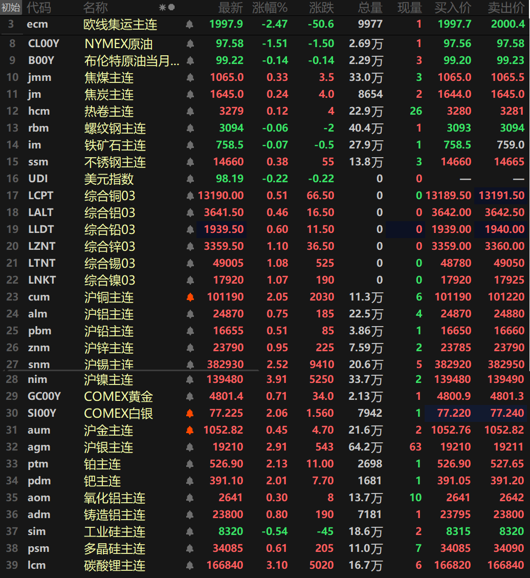 此外,碳酸锂主连涨3.1%,多晶硅主连涨0.61%,工业硅主连跌0.54%。欧线集运主连跌2.47%报1997.9。