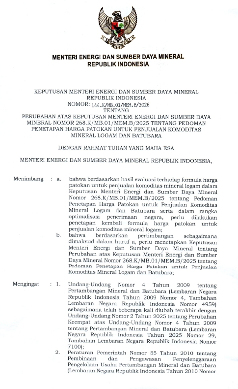 雅加达,2026年4月14日–印尼能源与矿产资源部 (ESDM) 正式发布了第144.K/MB.01/MEM.B/2026号部长令,修订了镍矿矿产基准价格 (HPM) 的计算公式。该法规将于 2026年4月15日 起正式生效,这标志着全球最大镍生产国——印尼在资源估值政策上的重大转向。