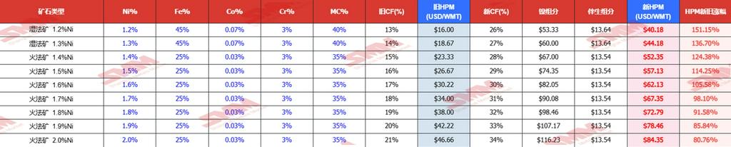 ·1.6%品位镍矿的修正系数(Correction Factor)从原来的 17% 大幅上调至 30%。