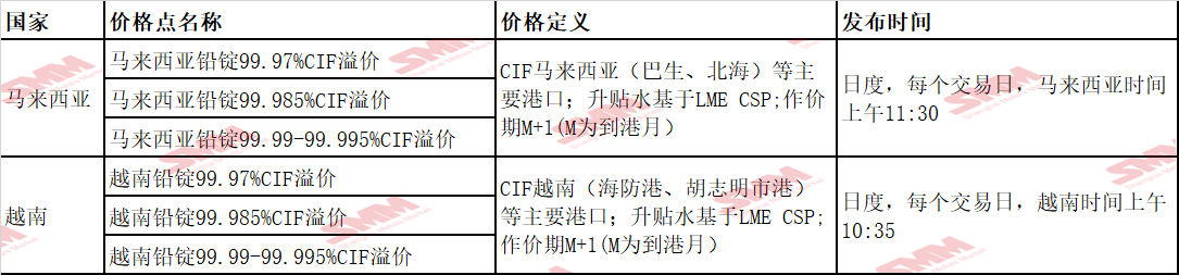 SMM马来西亚和越南铅锭CIF溢价是SMM根据本方法论形成和发布,可以被交易双方用来作为海外市场铅锭CIF溢价贸易结算参考依据的指示性价格。该价格反映的是每个完整工作日马来西亚、越南铅锭CIF溢价发布时实际成交或潜在可成交的现货交易价格区间。以上6个价格点将于2026年4月15日正式上线,届时可从SMM官网(smm.cn)同步查看历史价格,价格的发布时间为当地每个法定工作日且为交易日上午。