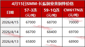 【SMM价格】2026年4月15日长振黄铜棒价格