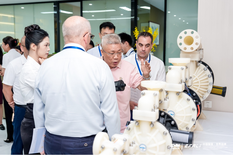 13日下午,考察团一行率先抵达位于佛山三山港国际创智园的伊莲辉(EFALI)总部。在精心布置的展区内,嘉宾们近距离观摩了伊莲辉(EFALI)的先导式技术与核心产品。从高耐磨、高耐腐蚀的定制化气动隔膜泵,到高度集成的一体化流体输送解决方案,其模块化设计与精密制造工艺赢得了国际友人与国内同行的高度赞誉。现场一位海外考察团代表感叹道:“伊莲辉(EFALI)是唯一一家针对新能源行业浆料物理特性,深度定制研发隔膜泵的厂商。其技术策略与解决行业痛点的能力,完美诠释了中国智造的极高水准。”
