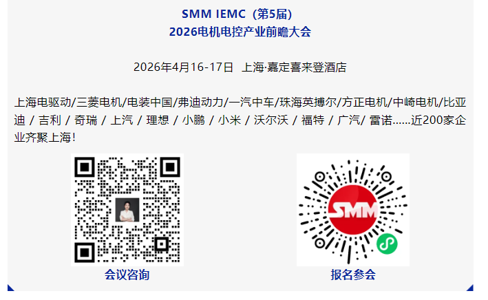 各位代表,感谢支持由SMM主办的SMM IEMC(第5届)2026电机电控产业前瞻大会,会议将于4月16-17日在上海·嘉定喜来登酒店举行。