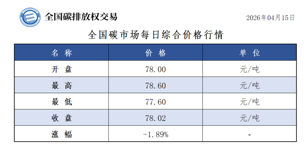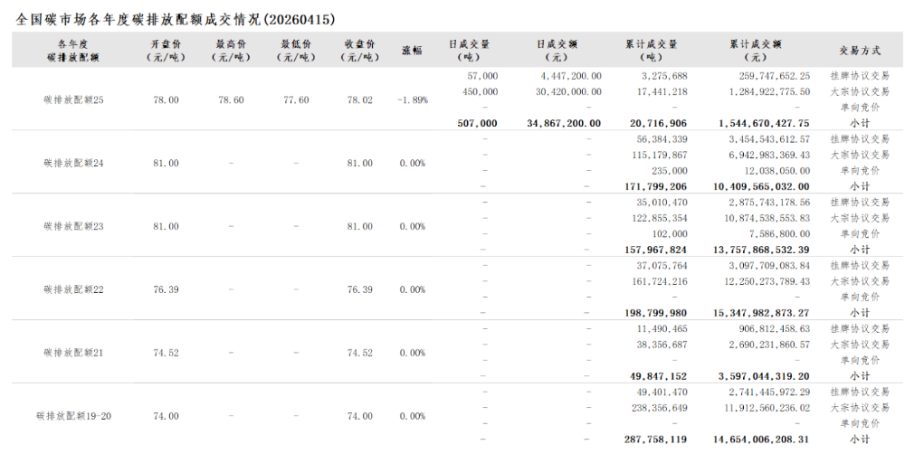 2026年1月1日至4月15日,全国碳市场碳排放配额成交量22,022,667吨,成交额1,648,519,161.35元。
