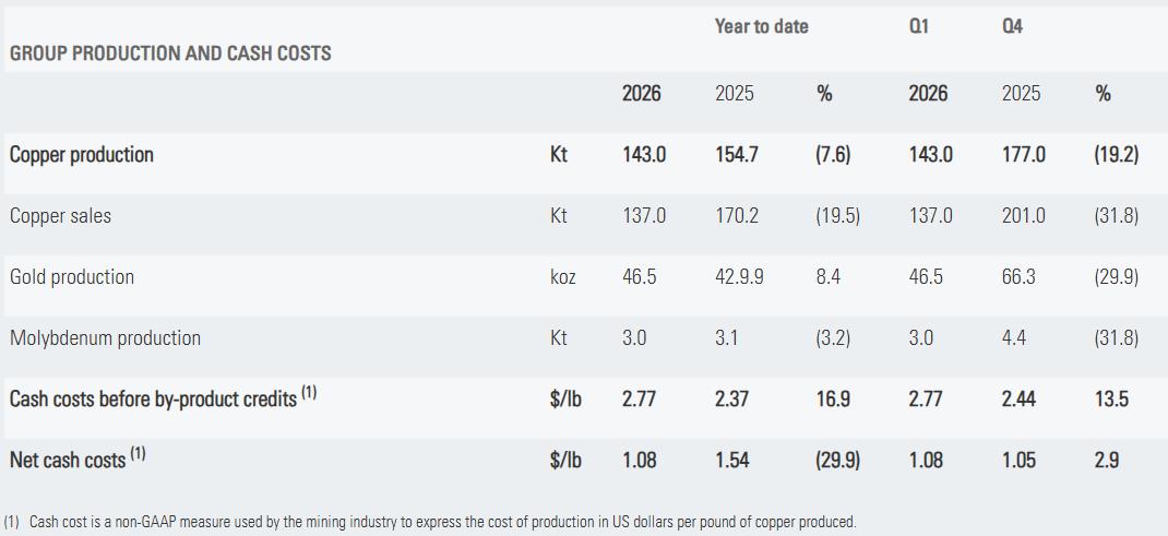 2026 年第一季度铜产量为143,000吨,同比下降8%。主要因集团旗下两大选矿厂——Los Pelambres与Centinela选矿厂矿石处理量下降、铜品位有所降低(符合矿山计划)。