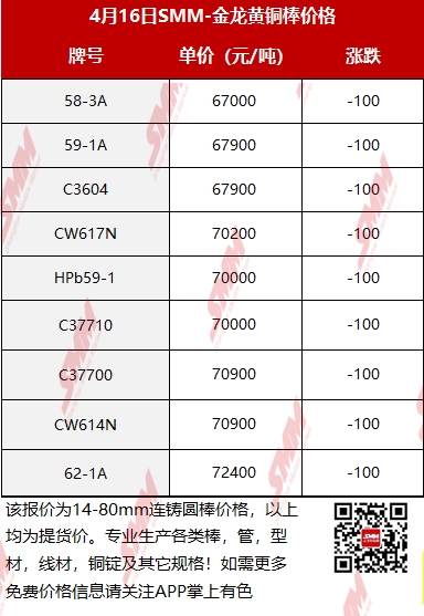 【SMM价格】2026年4月16日金龙黄铜棒价格
