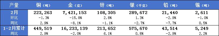 秘鲁能源与矿业部发布的数据显示,秘鲁2026年2月铜产量为223,263吨,同比增加2.9%。1-2月累计产量为449,519吨,同比增加2.9%。