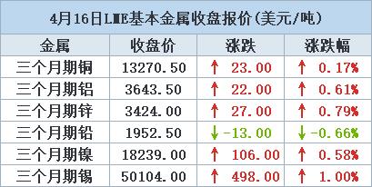 伦敦时间4月16日17:00(北京时间4月17日00:00),LME三个月期铝上涨0.61%或22.00美元,报每吨3,643.50美元,此前曾触及每吨3,672美元的2022年3月24日以来最高水平。