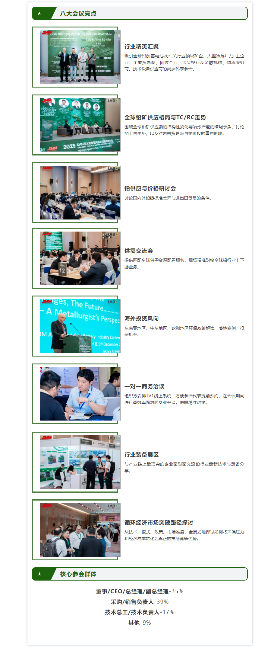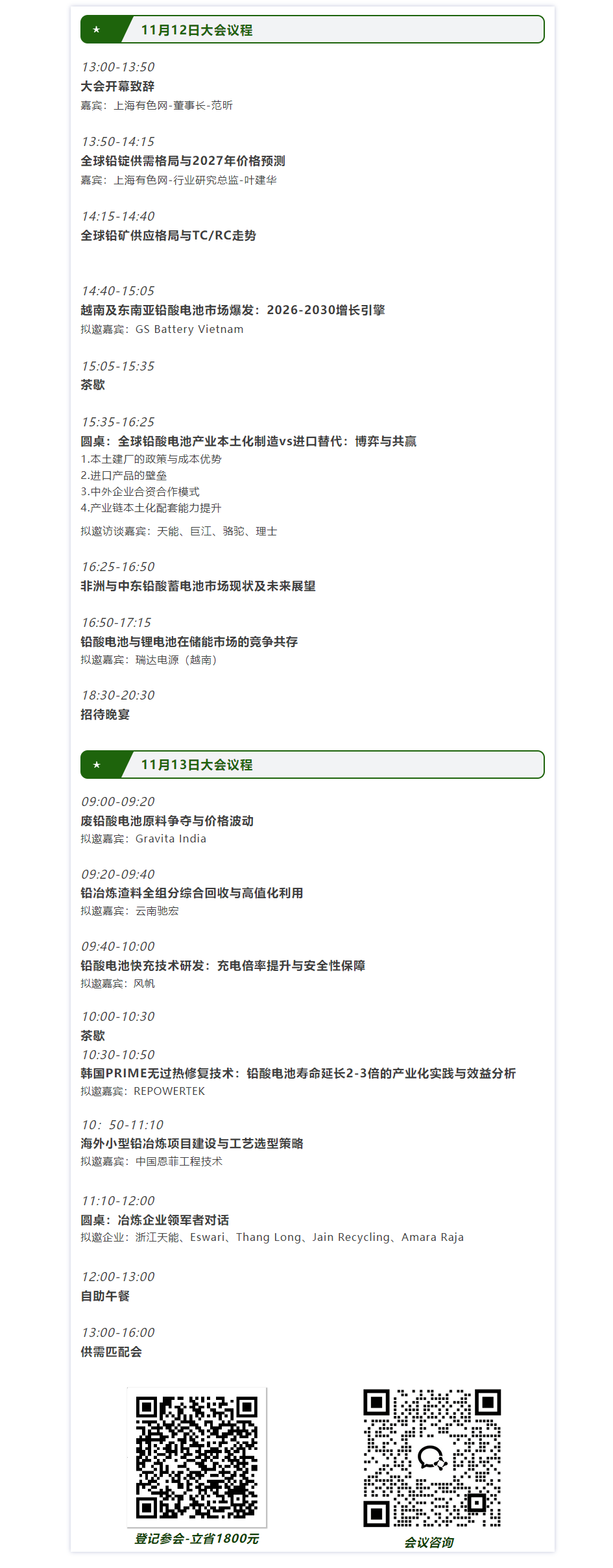 2026SMM全球铅酸蓄电池供应链创新大会旨在汇聚全球铅酸电池企业、铅冶炼企业、铅锭贸易企业、铅原料企业以及相关设备、辅料企业等各方力量。通过深入探讨全球铅产业链市场现状与未来发展趋势、亚太国家铅产业链出海政策差异与合规应对、贸易战对铅电池消费市场的影响等重要议题,为企业提供精准的市场洞察和战略指导,助力企业在复杂的市场环境中把握机遇,实现全球铅酸电池供应链的绿色重构和可持续发展 。