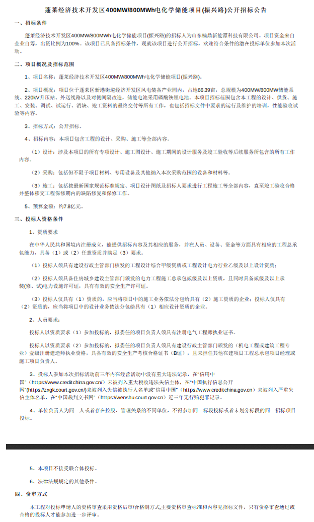 公开资料显示,该项目位于山东烟台市蓬莱区新港街道经济开发区风电装备产业园内,占地66.39亩,总规模为400MW/800MWh,建设内容包括储能系统、220kV升压站、外送线路及控制回路改造、磷酸铁锂电池采购等。招标范围涵盖设计、采购、施工等EPC总承包全部内容,预算金额约7.8亿元。