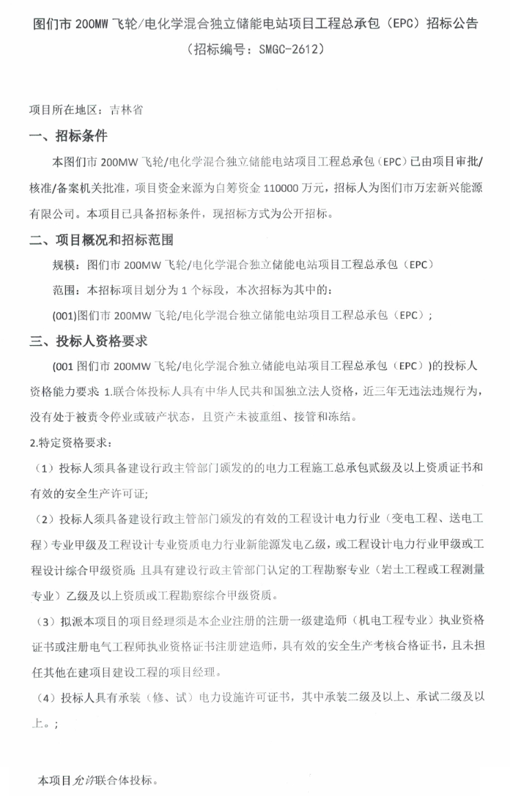 北极星储能网讯:2026年4月16日,吉林省图们市200MW飞轮/电化学混合独立储能电站项目EPC招标,项目资金来源为自筹资金110000万元。招标人图们市万宏新兴能源有限公司为上海融新投能源集团与阳光国际能源集团共同控股企业。项目不接受联合体投标。
