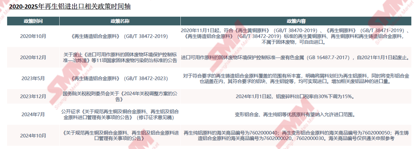 据SMM分析,2018年,其他废铝碎料(760200090)调整至《限制进口类可用作原料的固体废物目录》。自2019年7月1日执行,全面禁止铝废料进口。2020年,符合《再生铸造铝合金原料》(GB/T 38472-2019)标准的再生铸造铝合金原料,不属于固体废物,可自由进口。自2020年11月1日起实施。2024年10月24日,生态环境部、海关总署等六部门发布《关于规范再生铜及铜合金原料、再生铝及铝合金原料进口管理有关事项的公告》。自2024年11月15日起实施。根据海关数据,2024年全年进口为178.5万吨,同比23年增加1.65%。