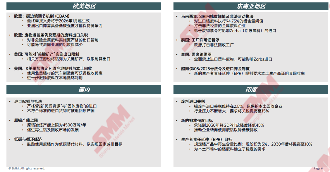 欧盟:2026年正式落地CBAM政策,六高碳行业的进口产品都会根据隐含碳排放和吨数进行额外收费。政策鼓励进口低碳产品和减少废铝出口,变相要求欧盟以外的国家也减低碳排放以达成改善国际气候变迁局