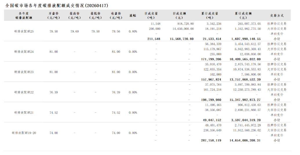 2026年1月1日至4月17日,全国碳市场碳排放配额成交量22,839,215吨,成交额1,711,838,882.15元。