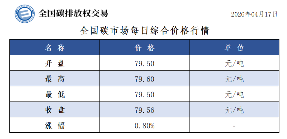 今日全国碳市场综合价格行情为: 开盘价79.50元/吨,最高价79.60元/吨,最低价79.50元/吨,收盘价79.56元/吨,收盘价较前一日上涨0.80%。