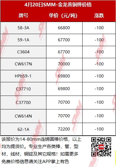 【SMM价格】2026年4月20日金龙黄铜棒价格